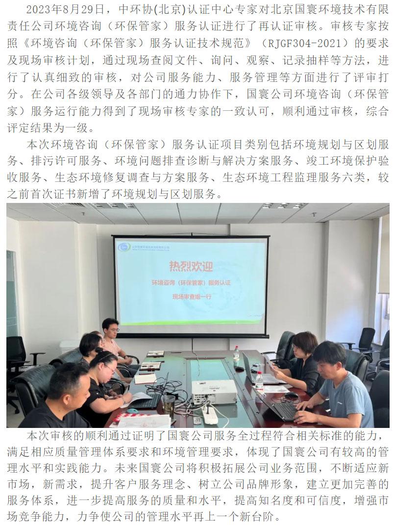 國寰公司“環境咨詢(環保管家)服務認證”再認證審核順利通過