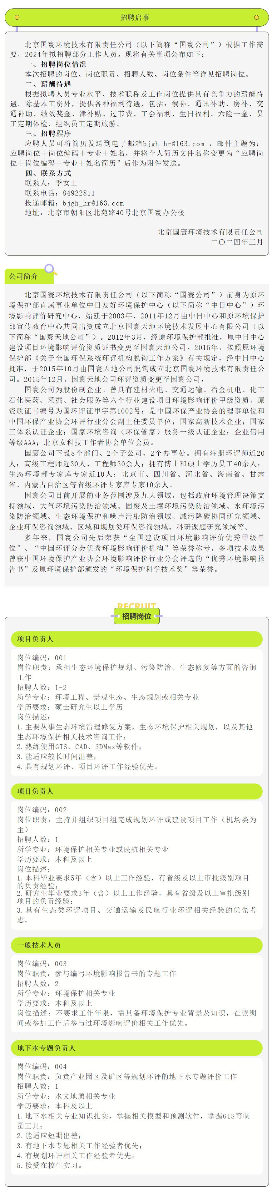 北京國寰環境技術有限責任公司招聘啟事