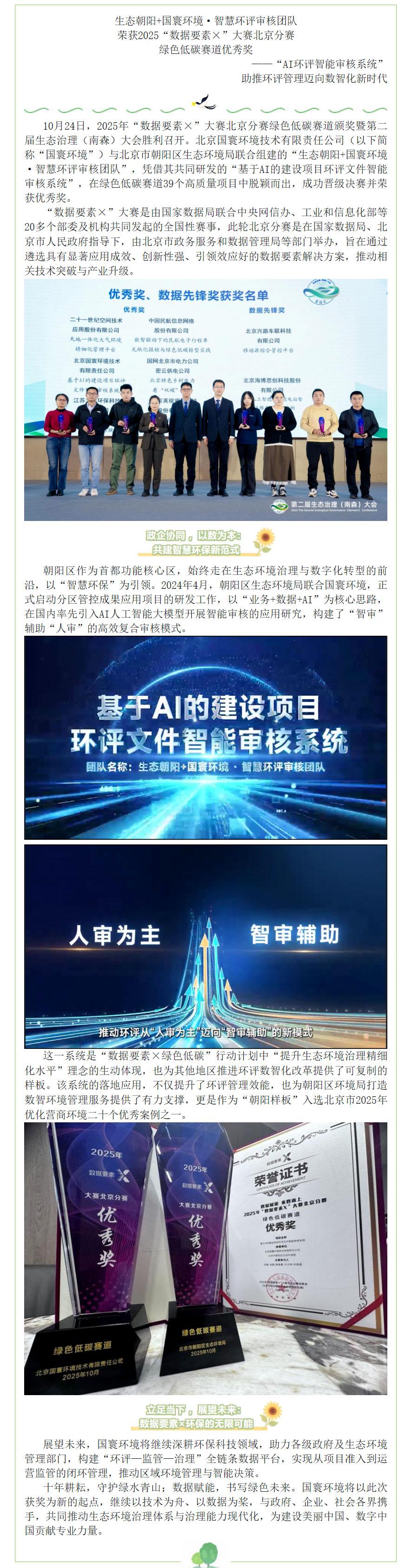 生態(tài)朝陽+國寰環(huán)境·智慧環(huán)評審核團(tuán)隊(duì)榮獲2025“數(shù)據(jù)要素×”大賽北京分賽綠色低碳賽道優(yōu)秀獎
